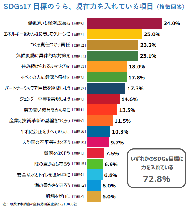 総じて、いずれかのSDGs目標に力を入れている企業は72.8%となり、SDGsに「取り組んでいない」などと回答した企業でも、気付かないうちにSDGsに取り組んでいる企業が多数あることが分かりました。