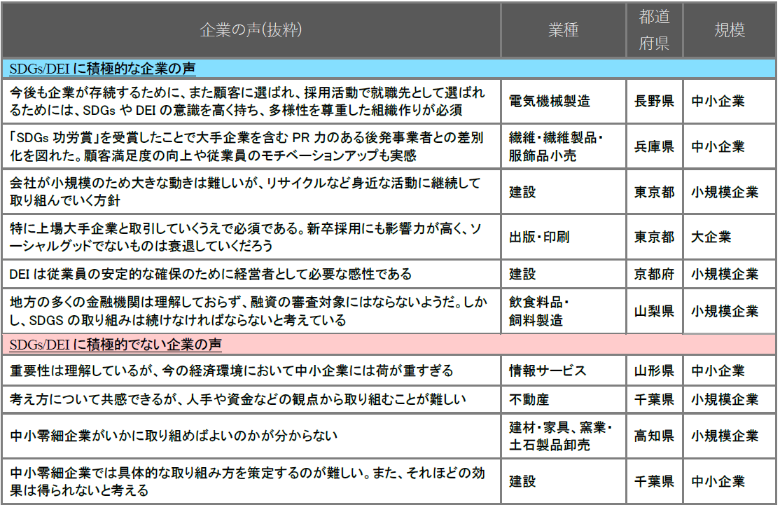 企業からは、「取り組まないと人員確保が難しいと感じる」(電気・ガス・水道・熱供給、神奈川県、中小企業)や「取引先からの取り組み状況の調査が増えている」(情報サービス、富山県、中小企業)の声にあるように、人材確保や取引先との関係強化を目的に取り組んでいる企業が複数みられました。