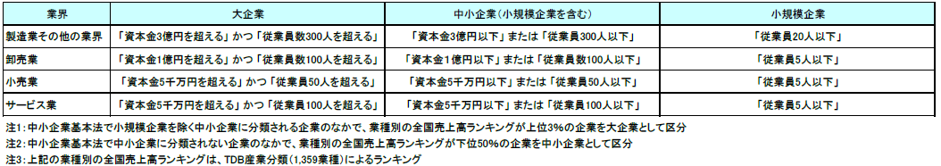 中小企業基本法に準拠するとともに、全国売上高ランキングデータを加え、下記のとおり区分しています。